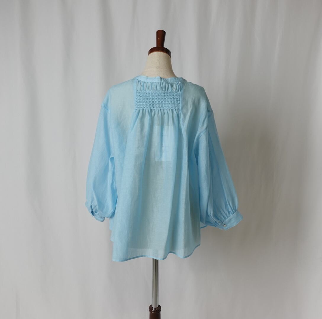 ふわふわとしていて正体の掴めない本能的な役柄のイメージからつくった、ギャザーとスモッキング刺繍が施されたかわいらしいブラウス。