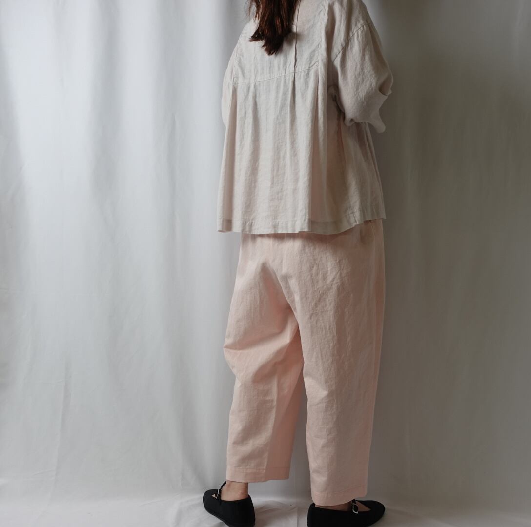 フロント部分の細やかなタックで丸みのあるシルエットですが、裾に向けてゆるやかなテーパードがかかっているので足さばきもよく、動きやすさもあります。