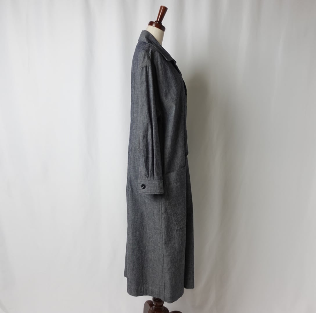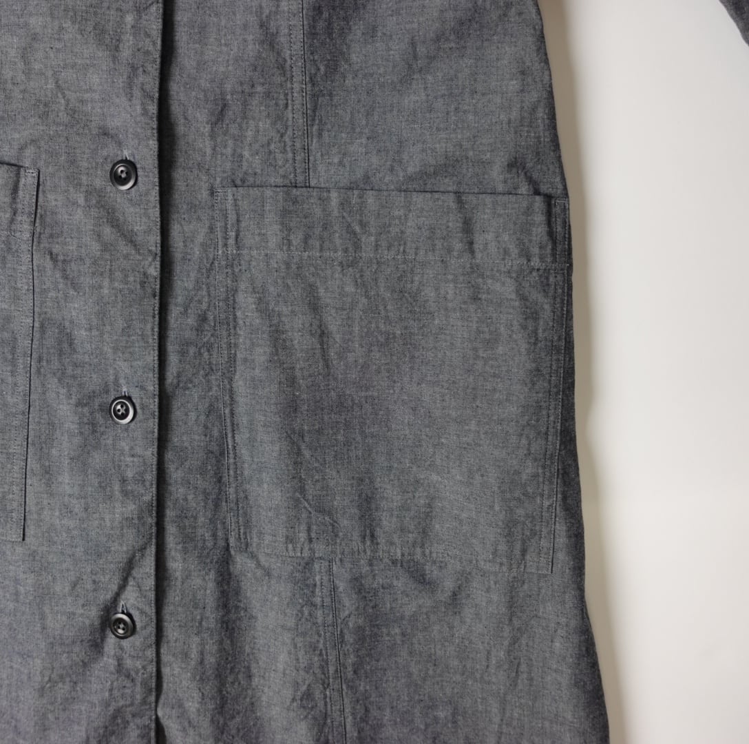 裾に向かってゆったりとしたデザインになっているので、足さばきがしやすい機能的な設計。フロントには大きなパッチポケットを配し、ワークドレスならではのディテール。