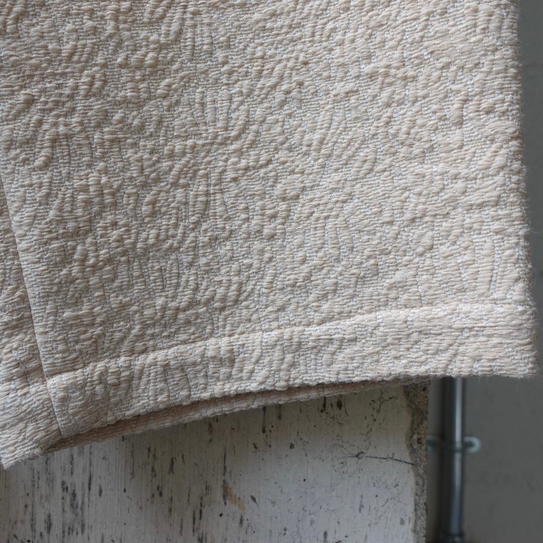 コットンと太いナイロン不織布でぼんやりとしたボタニカル柄をジャガードで描いた生地です。