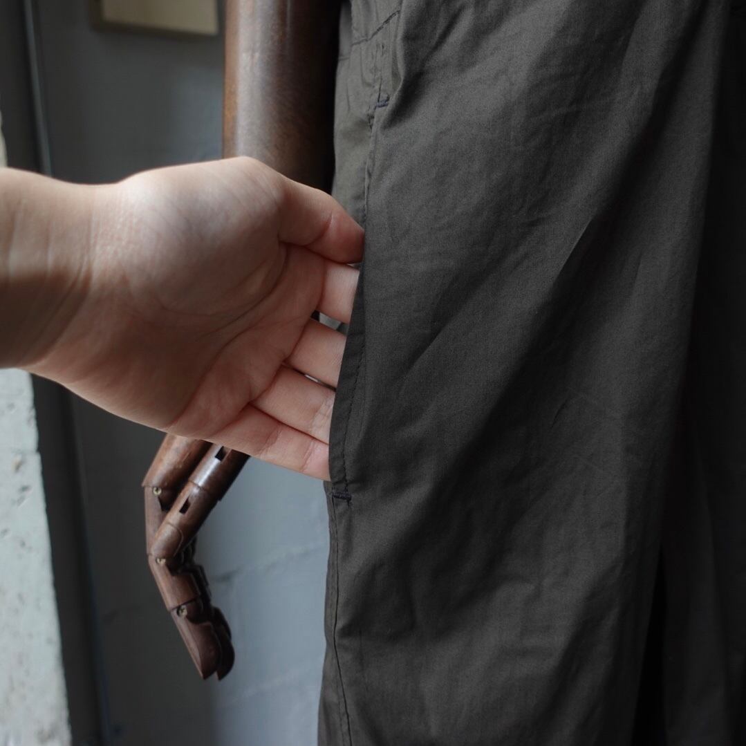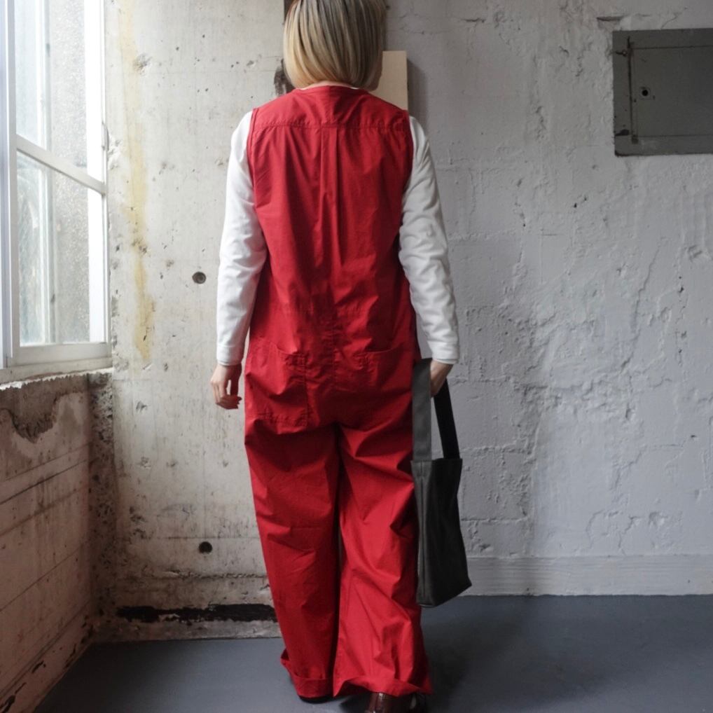 パンツ部分はタイパンツのような少し重なりのあるデザイン、フロント部分は重なり合ったデザインでワークテイストの中に上品さを感じる仕上がり。