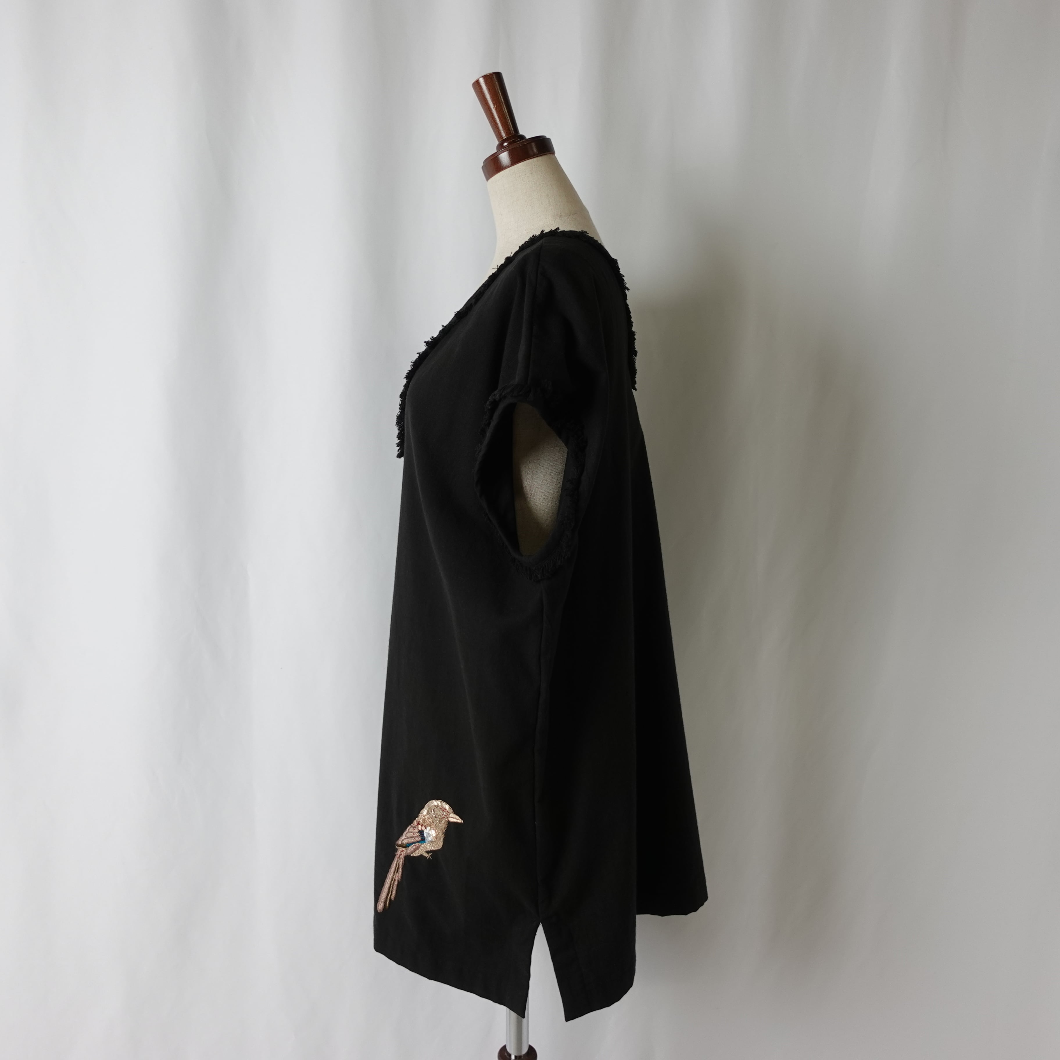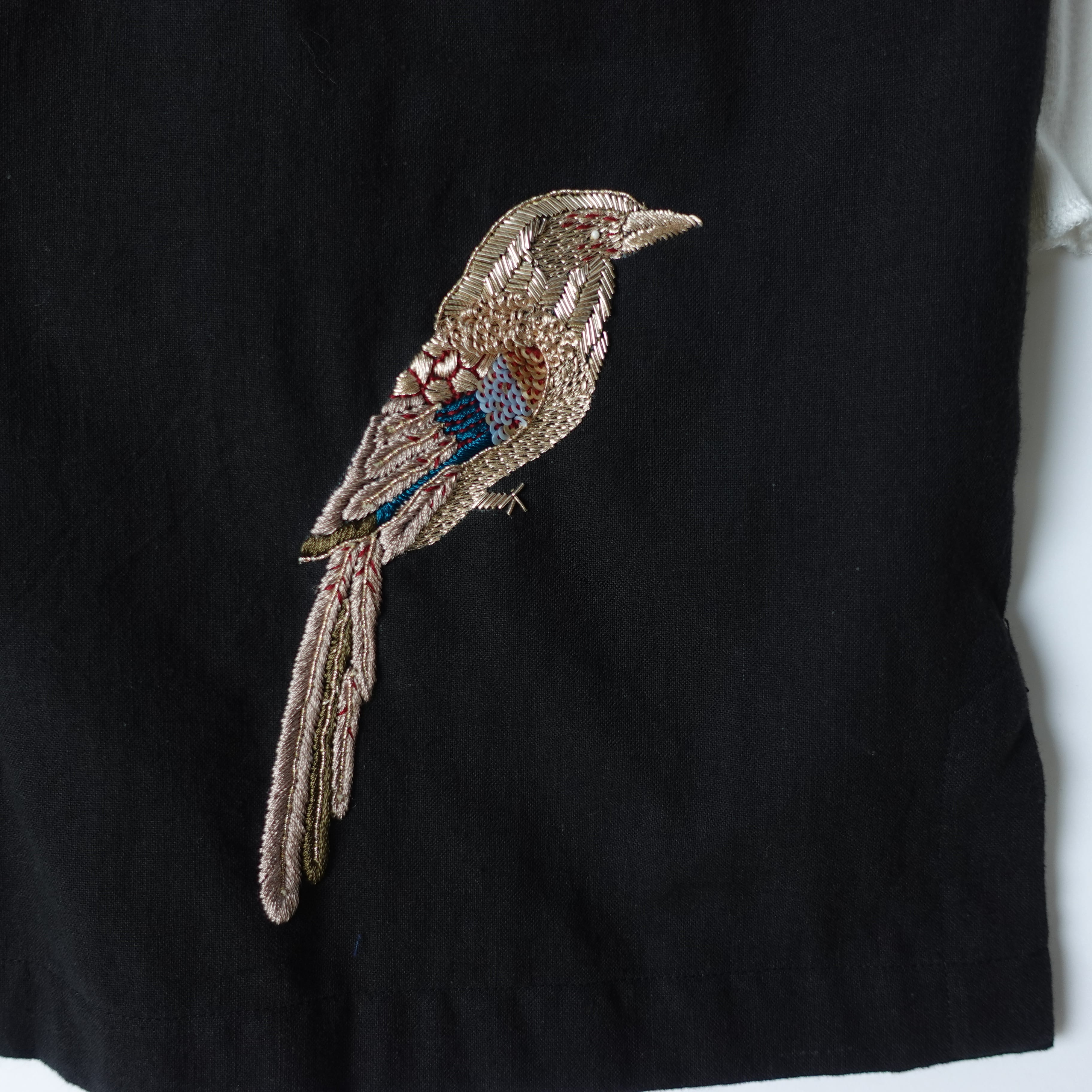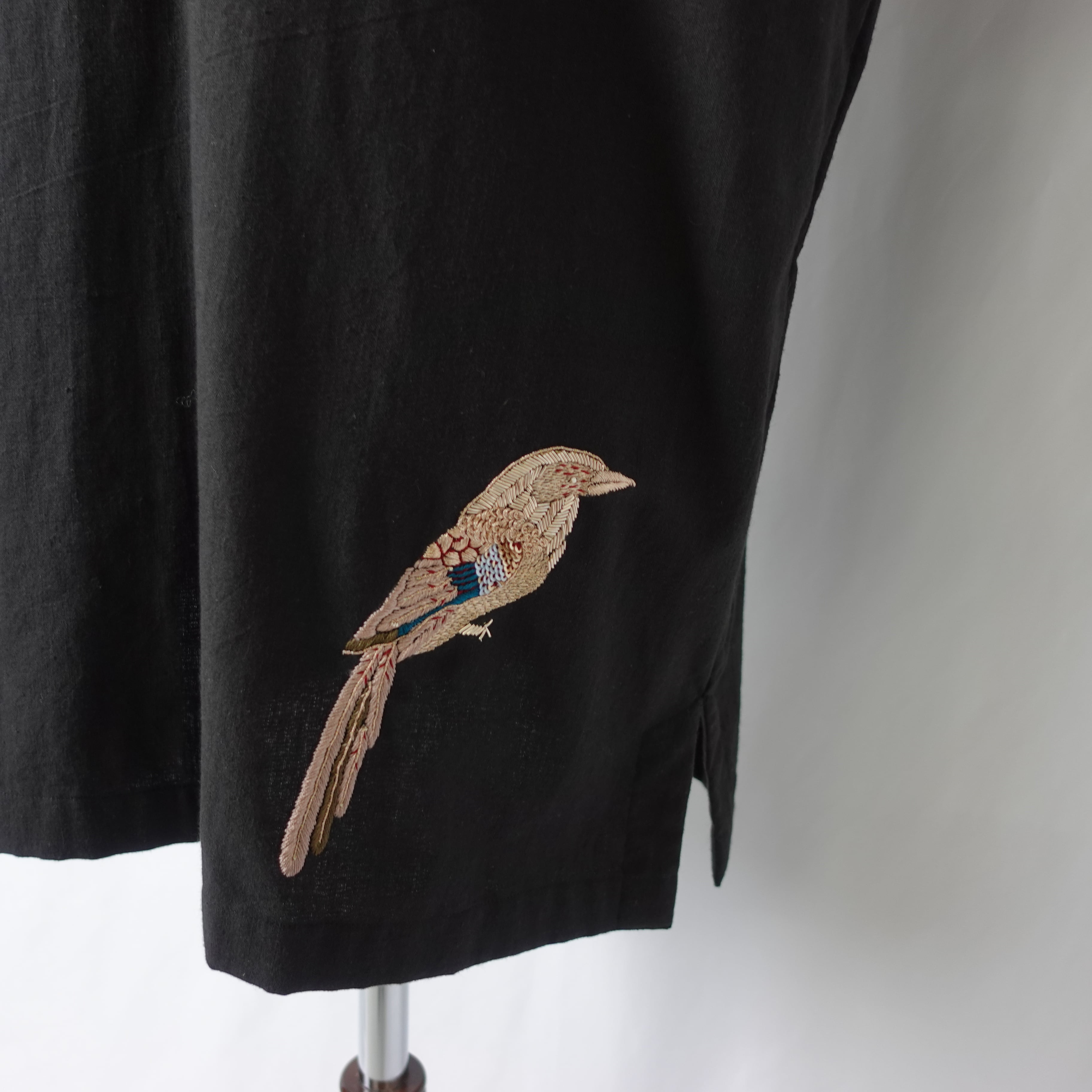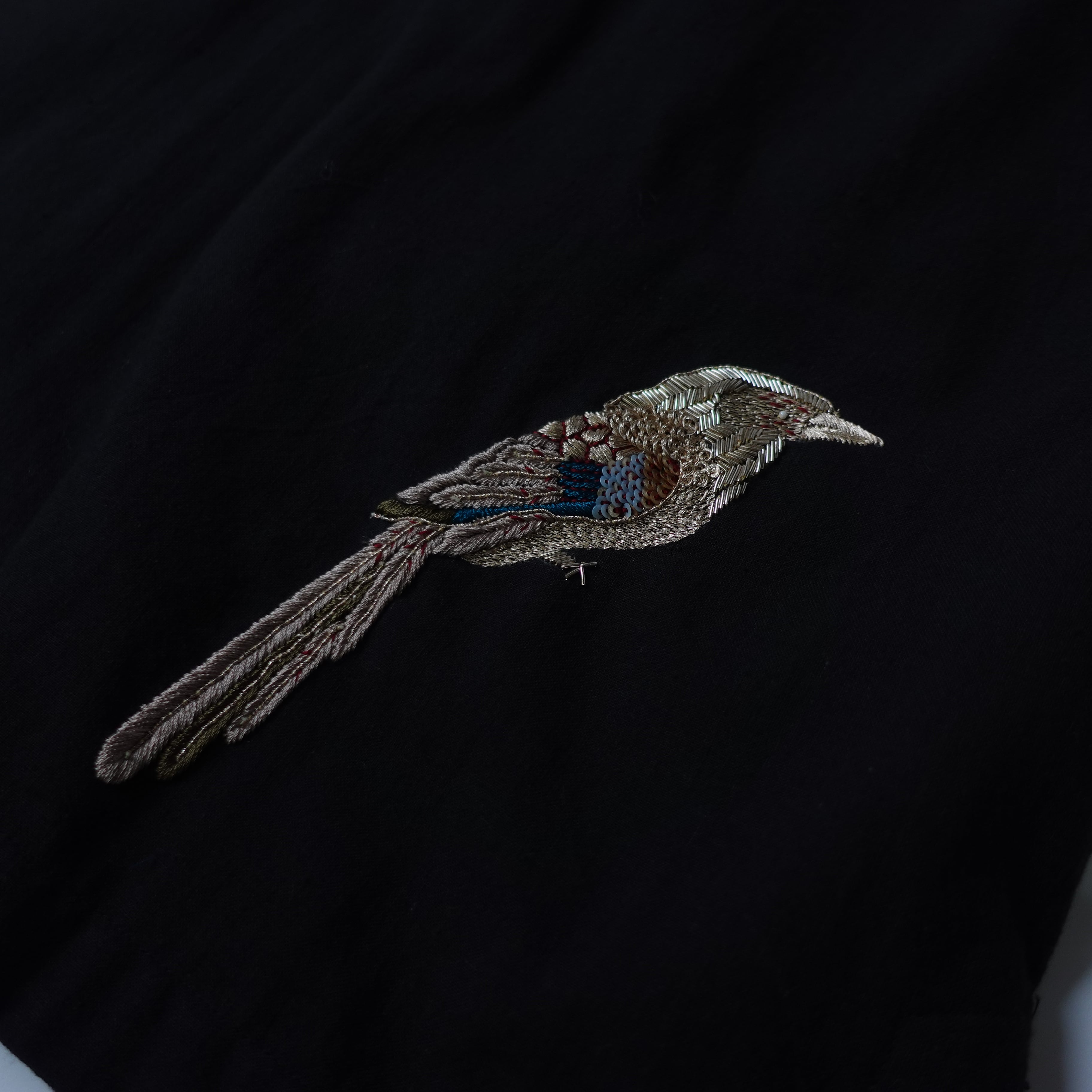 鳥のザリ刺繍で、目を惹くコーデのアクセントに。