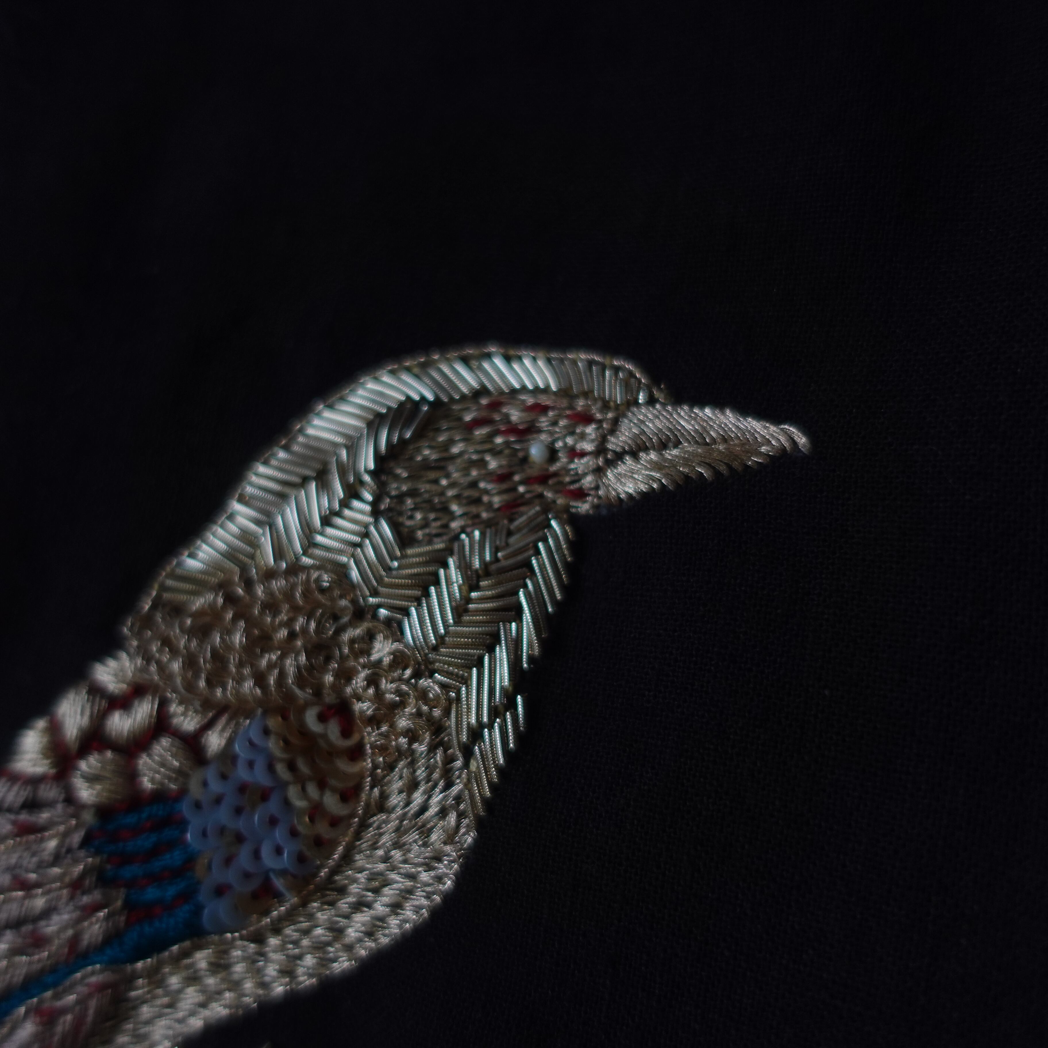 裾の鳥はインドの伝統的な刺繍方法のザリ刺繍でつくられたもの。