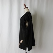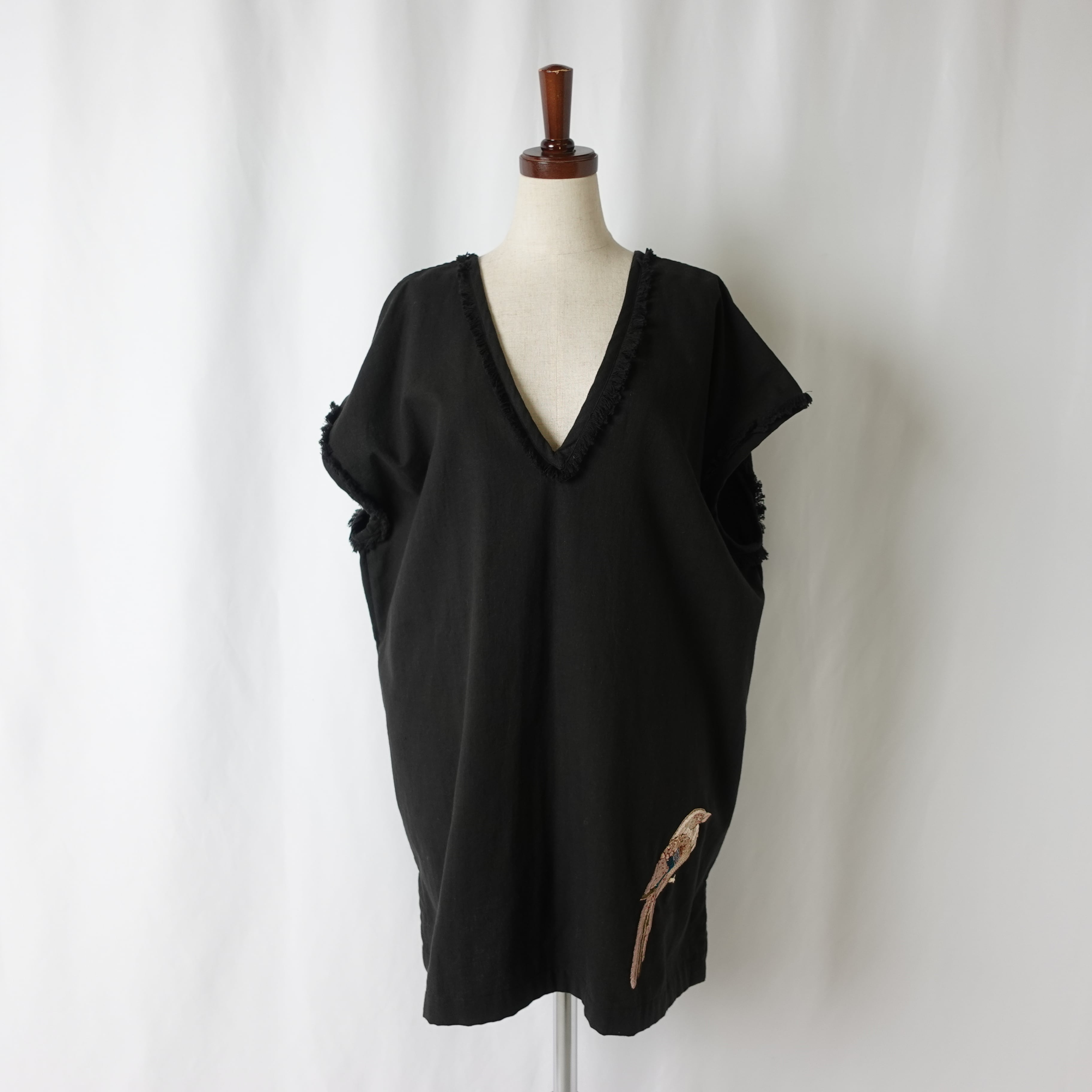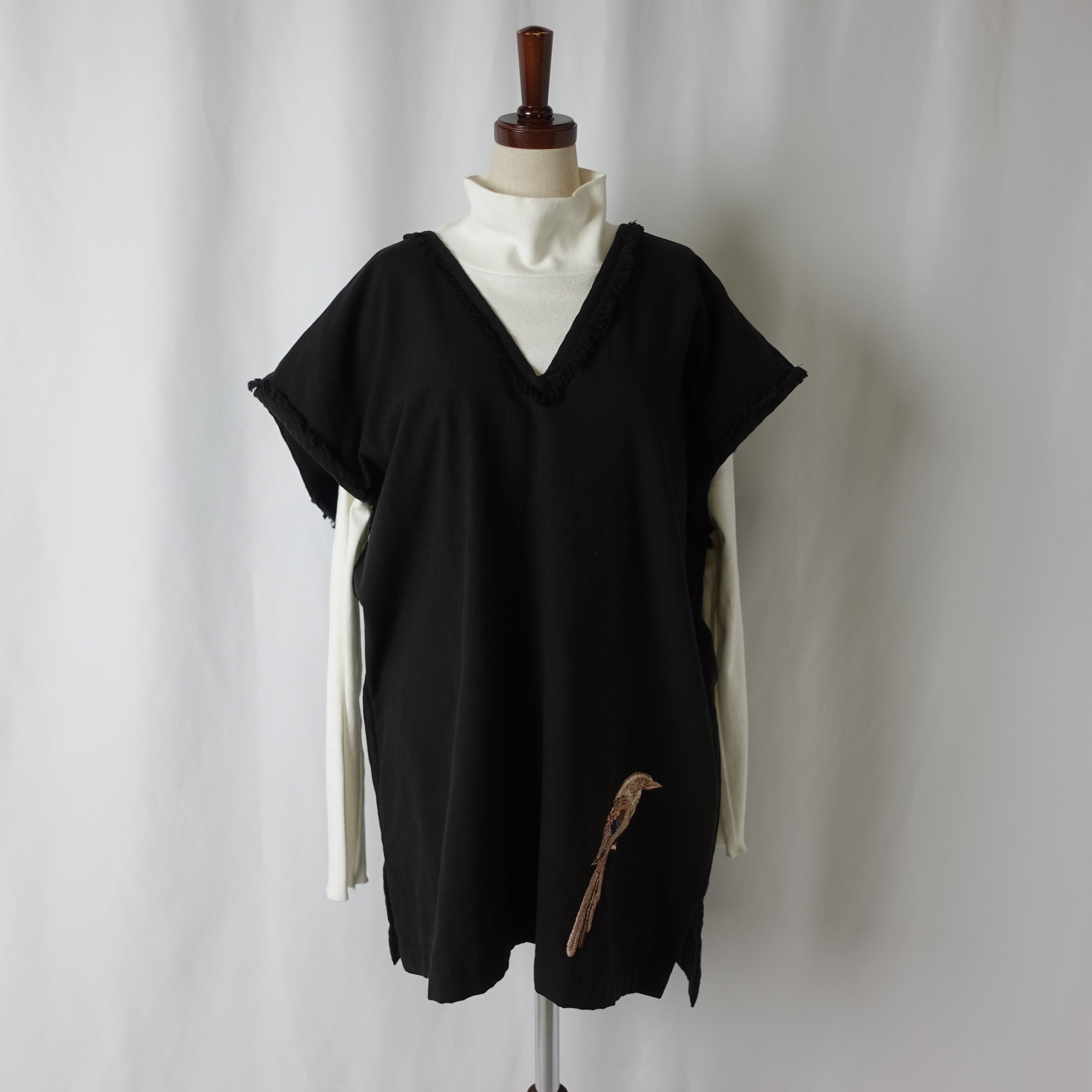 裾に一羽の鳥の刺繍が施された、ワイドベスト。