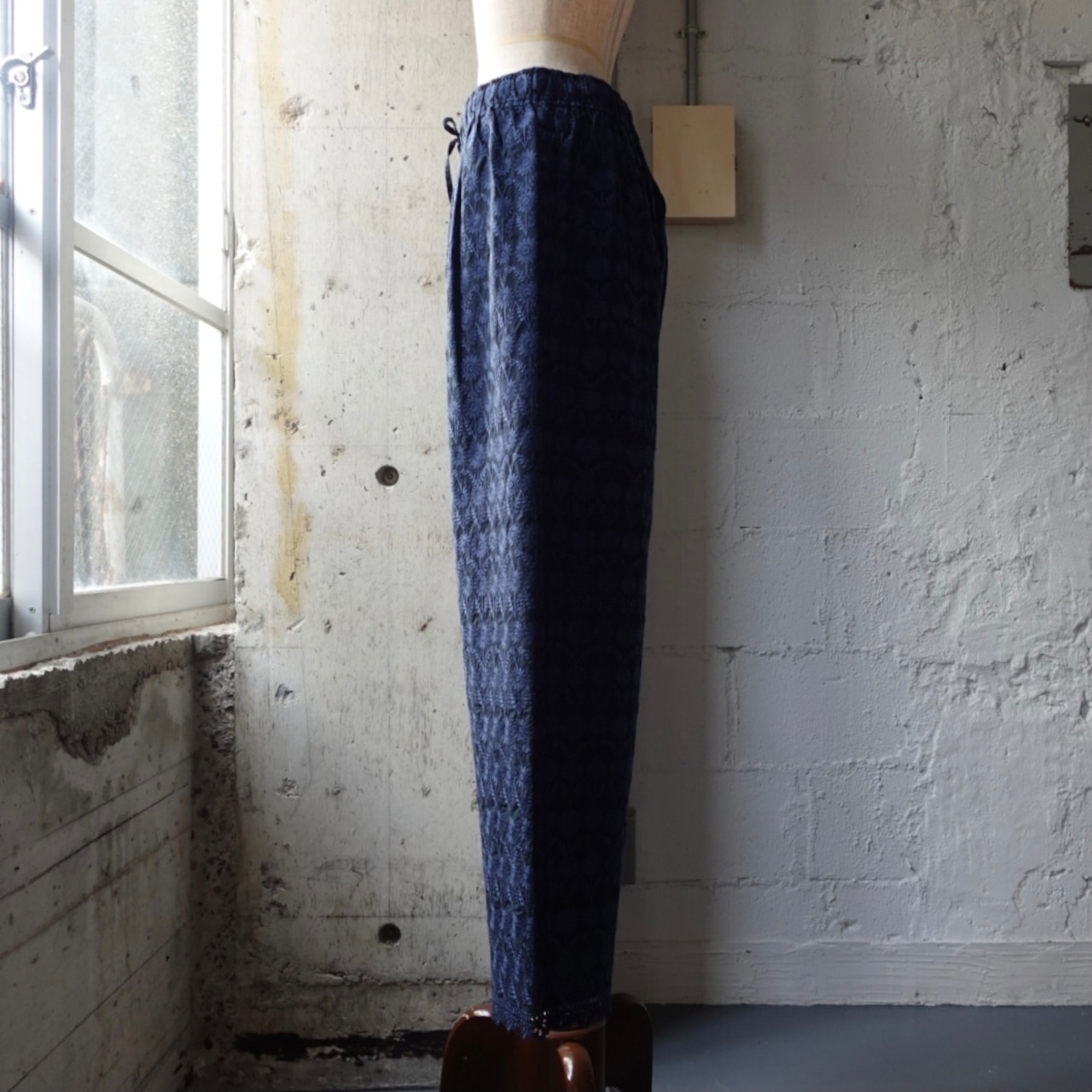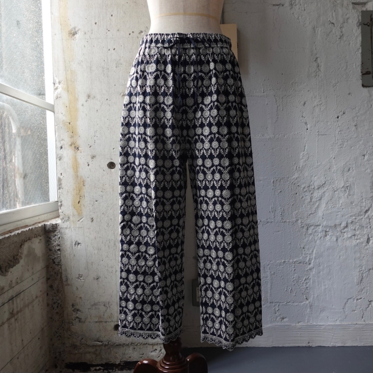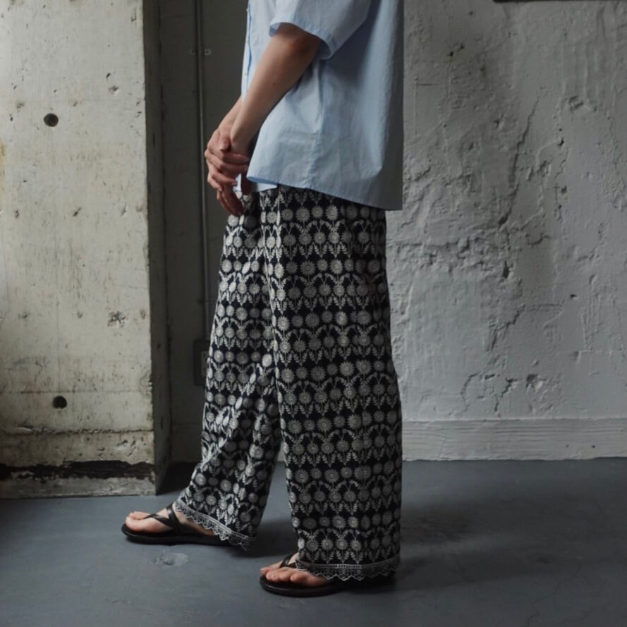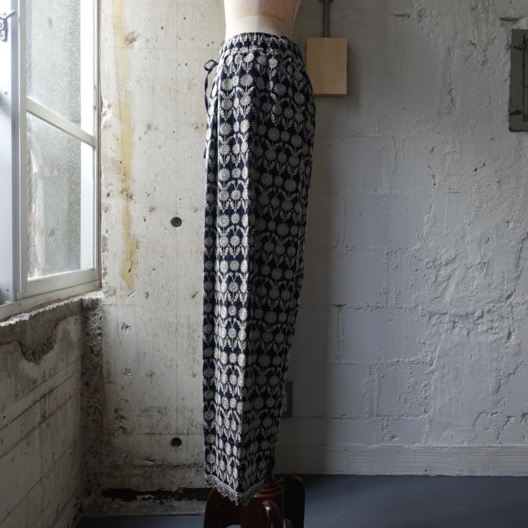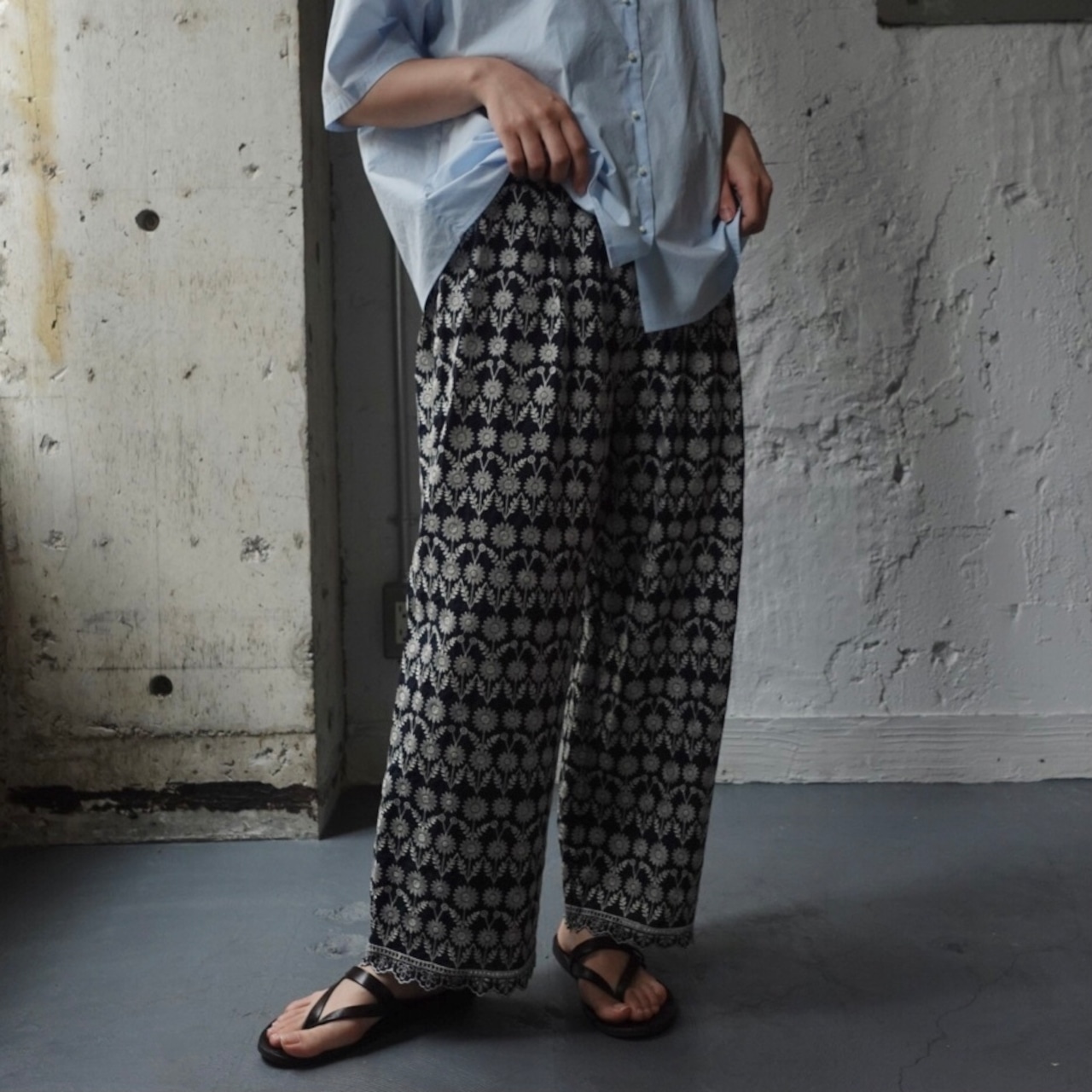 中東地域の伝統的なモチーフをイメージされたオリジナルの刺繍生地のパンツ。